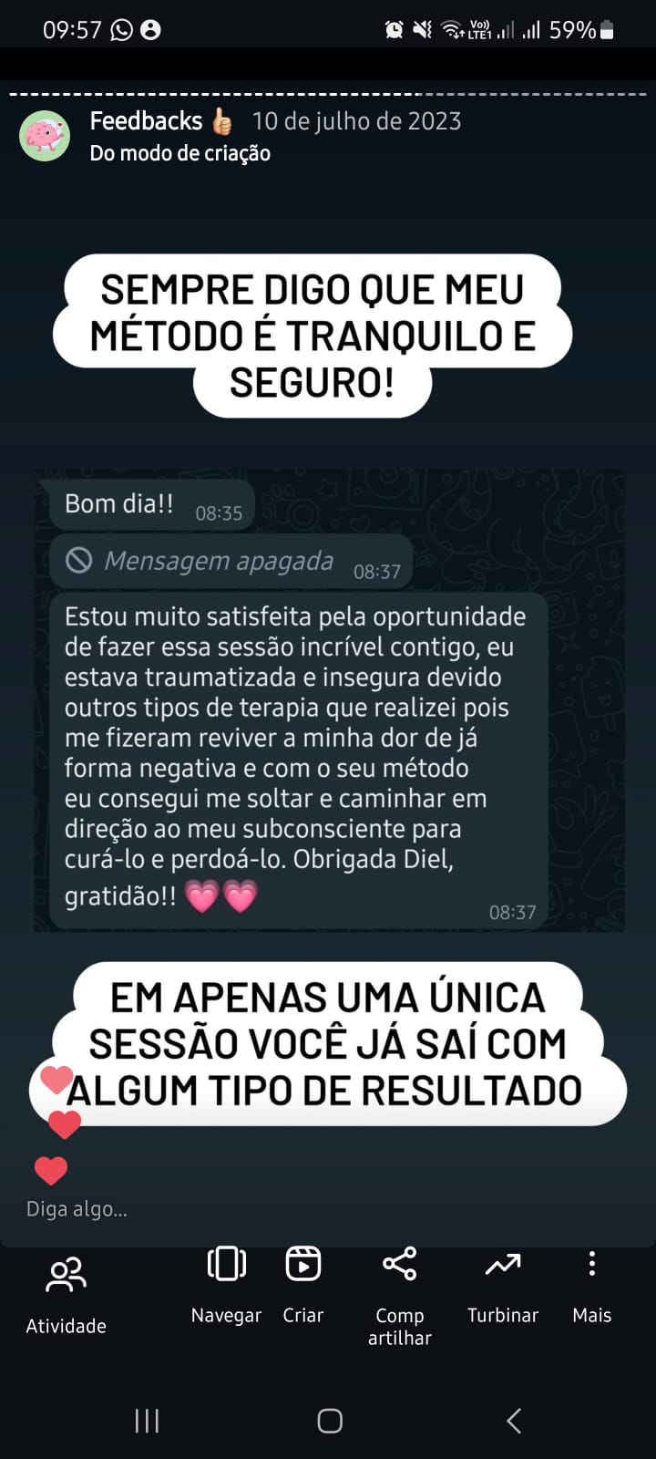 E sabe por que muitas não sentem isso? Porque recebem um tratamento padronizado, como se fossem iguais a todo mundo. Mas você não é igual a todo mundo, concorda?Foi por isso que mergulhei de corpo e alma em diversas abordagens,Psicanálise, PNL, Hipnose Clínica, EFT, Constelação Familiar, Medicina Germânica, Reintegração Somato Biológica, Análise Psico-Comportamental, entre outras para desenvolver um método único, feito sob medida para você. Nada é genérico. Nada é automático. Cada sessão é profundamente personalizada para te levar direto à raiz do que te bloqueia e te libertar.